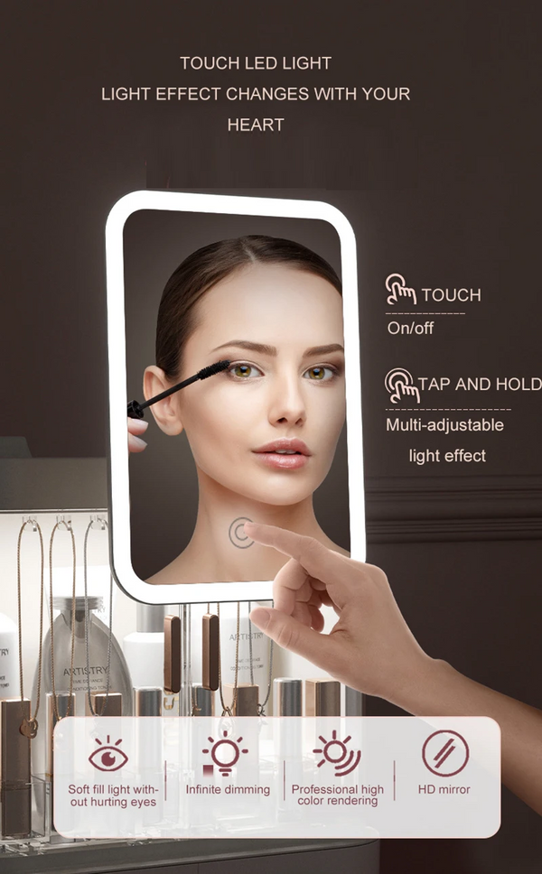 The LED lighting is easily activated, providing soft and adjustable light for perfect makeup application.